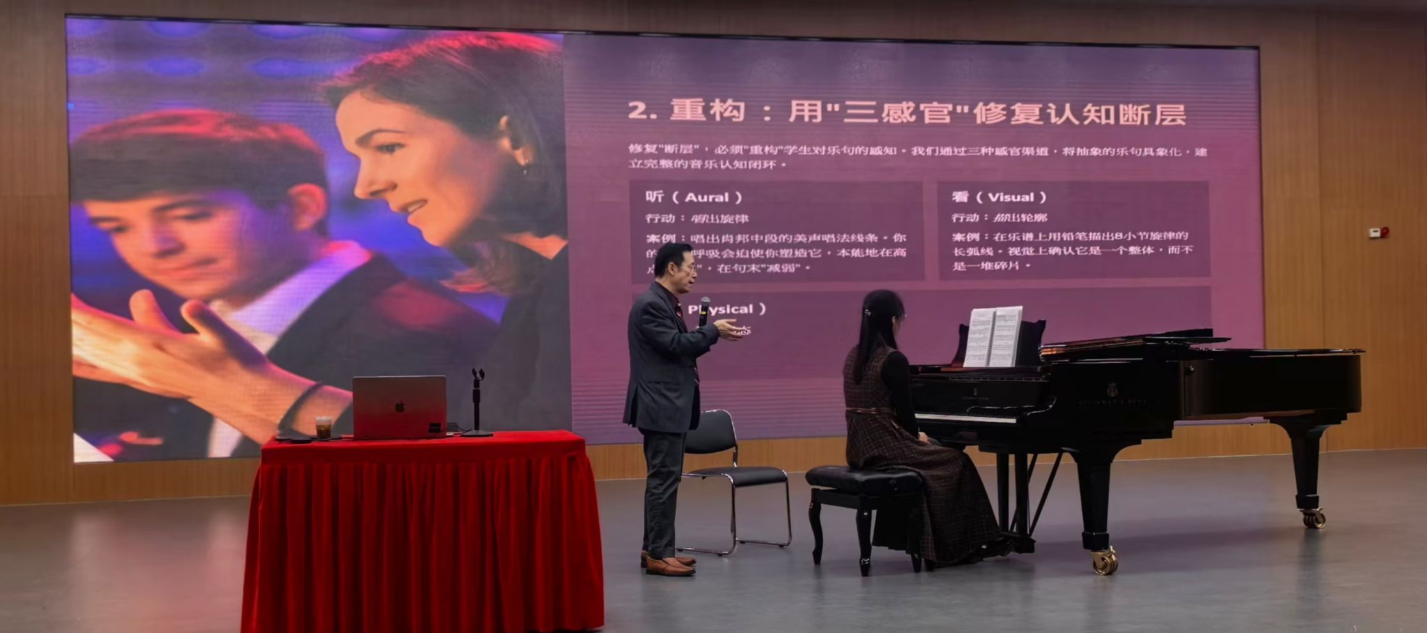 卜劼教授两获美国教育部“杰出教师总统奖”,本科毕业于上海音乐学院,曾执教中央音乐学院,创办美国内华达艺术学院并任院长,培养学子屡摘国际赛事大奖,其“老谱谈琴”“老谱MusicAI”项目实现音乐科普与智能教育深度融合。讲座中,他结合中美教育实践经验,从音乐表达核心影响因素切入,提出钢琴学习“断层”纵横诊断方案与系统重构路径,通过具象案例解析技巧断层瓶颈及补建方法,让抽象音乐表达可感可学。