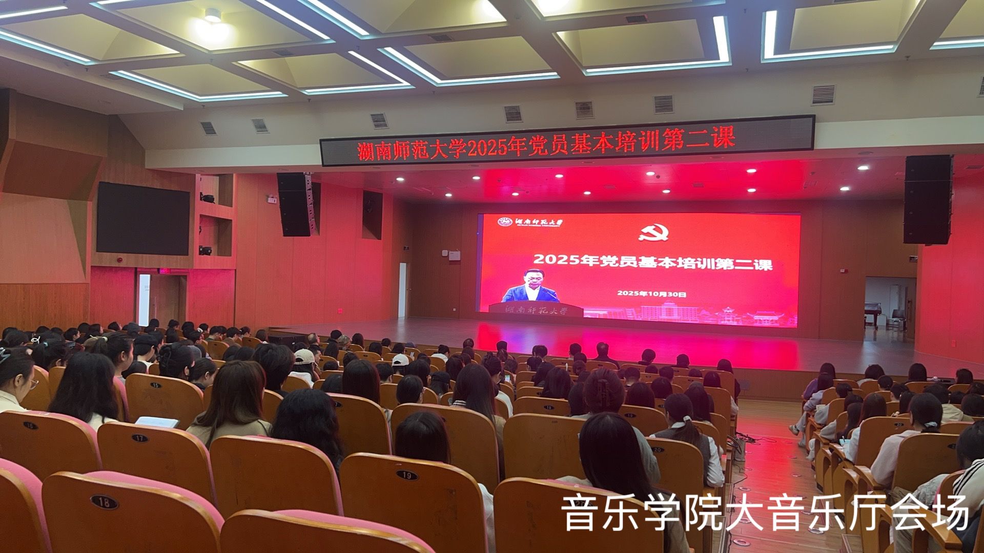 为深入学习贯彻习近平新时代中国特色社会主义思想,加强党员党性修养,提升党员教育培训工作实效,完成教育部“高校师生党员基本培训扩大试点工作”任务,音乐学院在学校统一安排下,于2025年10月30日下午15:00在和乐楼大音乐厅开展了基本培训第二课。