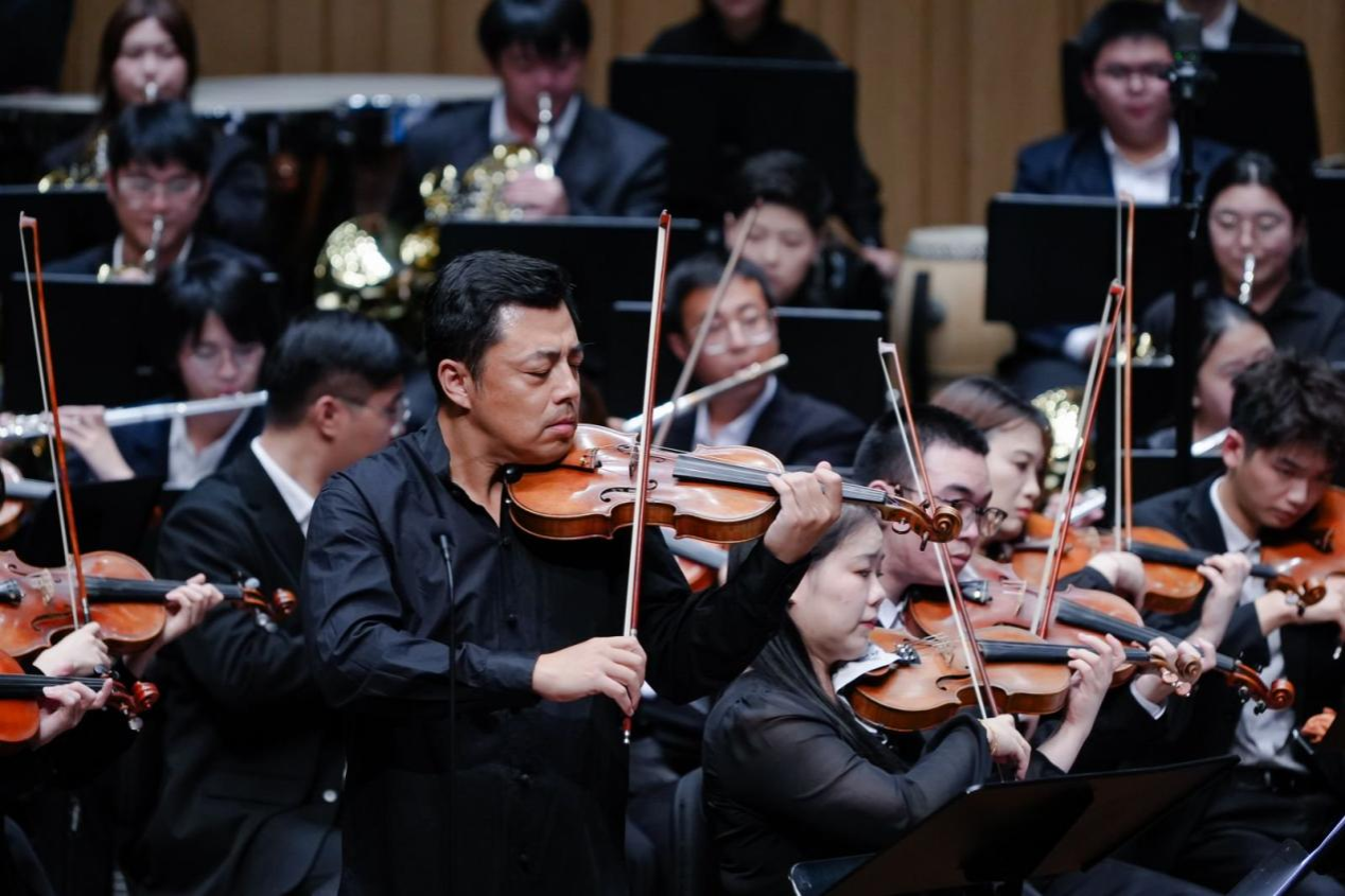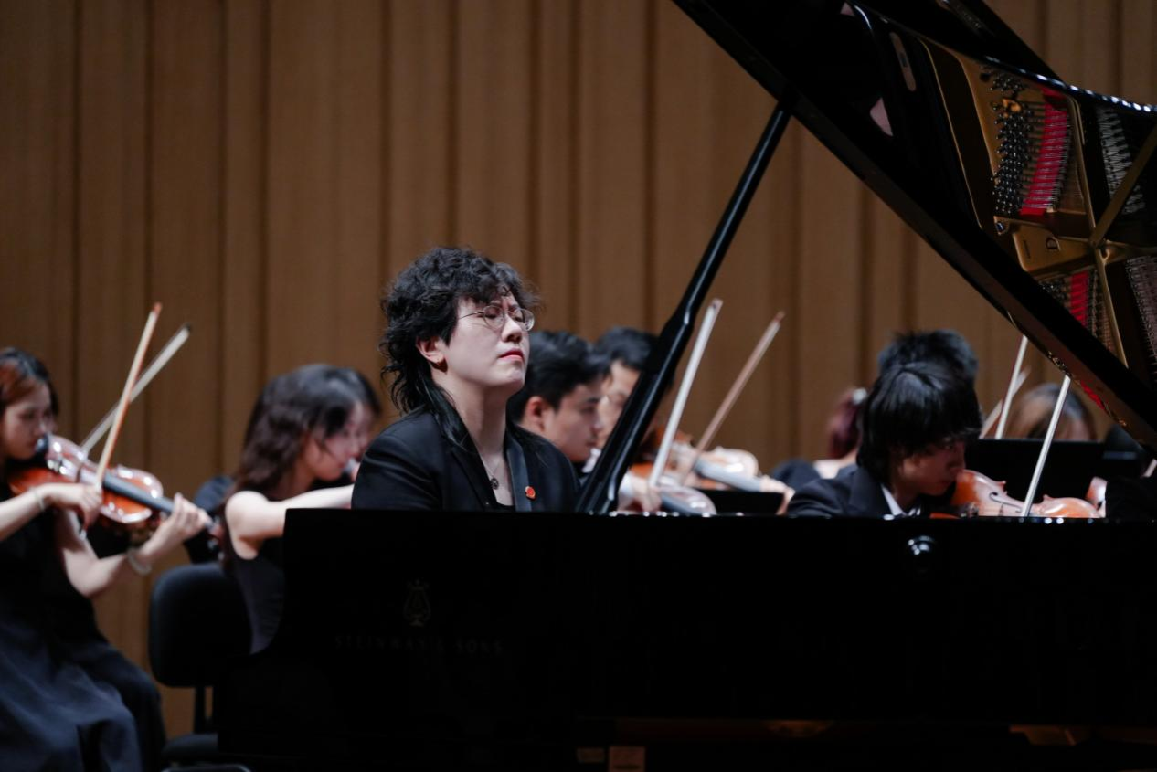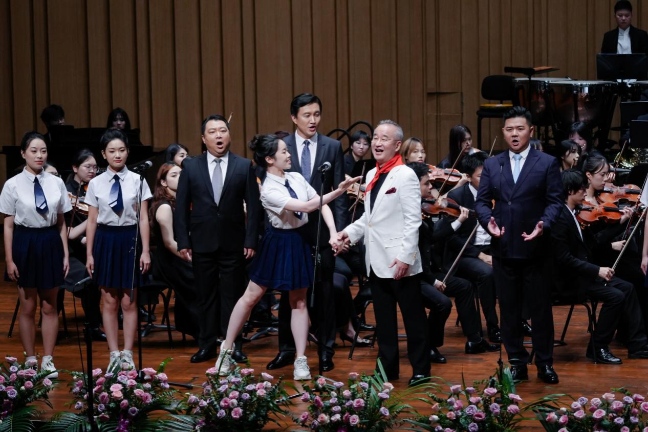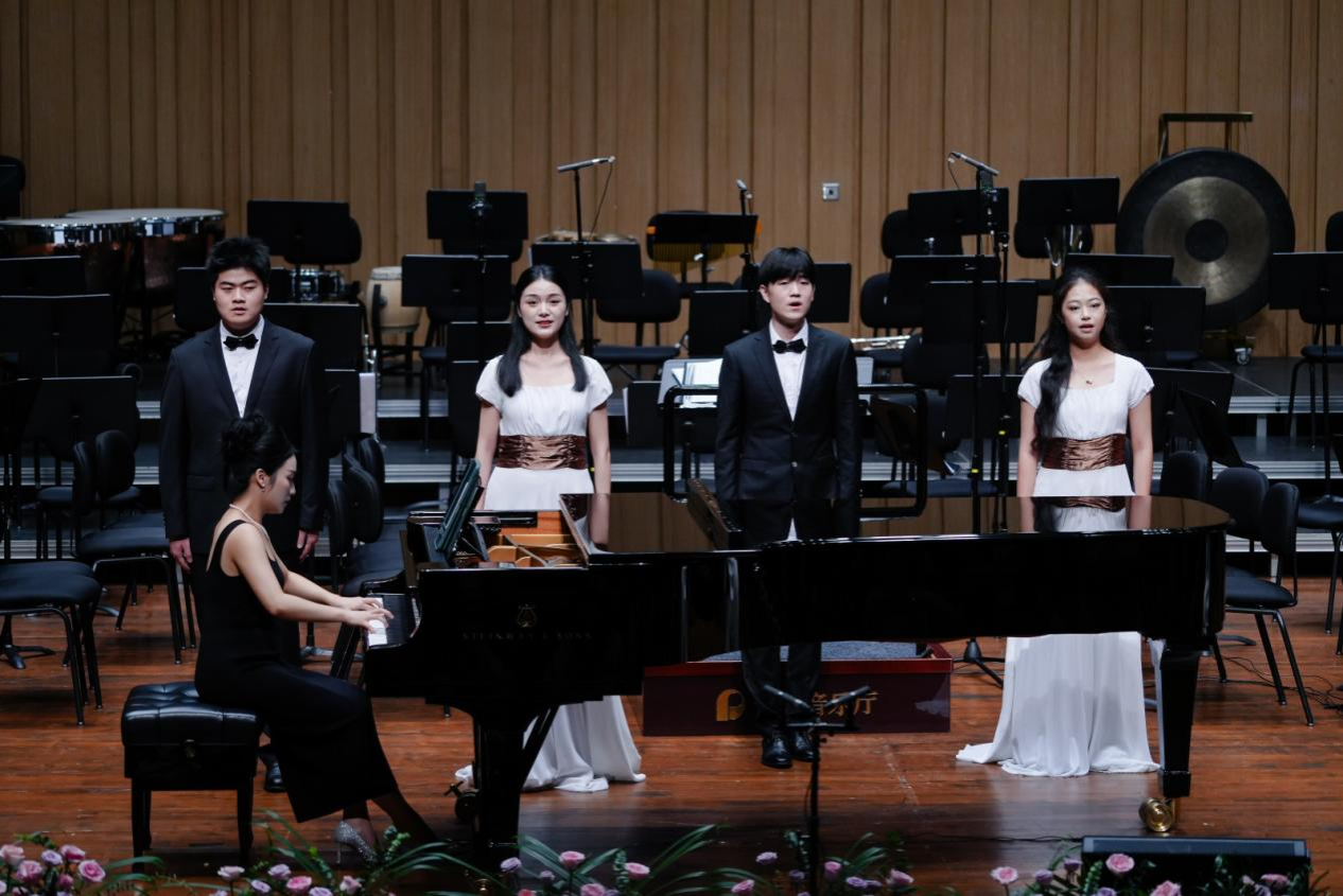 音乐会在潇湘爱乐交响乐团充满浓郁湖南味道的管弦乐《花鼓抒怀》中拉开帷幕。作品由音乐学院院长廖勇教授创作,将湖南花鼓戏的灵魂旋律和独特元素融入交响语境,彰显了厚重的地域文化底蕴。随后,青年教师王艺璇、博士生曲丹分别演唱了《岳麓书院》《高山流水》,显示出金钟奖实力的完美唱功。青年教师王文洁、陈薪竹、彭帅理、陈浩然合作的器乐合奏《Tico Tico》节奏明快,嗨翻全场。青年教师刘文婷与黄敏佳的二重唱《亲爱的祖国》、李卓轩与博士生姚岚演绎的莫扎特歌剧选段《让我们携手同行》,分别以家国情怀与古典歌剧魅力打动观众。青年教师周末表演的钢琴协奏曲《保卫黄河》激昂慷慨,奏响民族精神强音,传达出音乐巨大的号召力量。