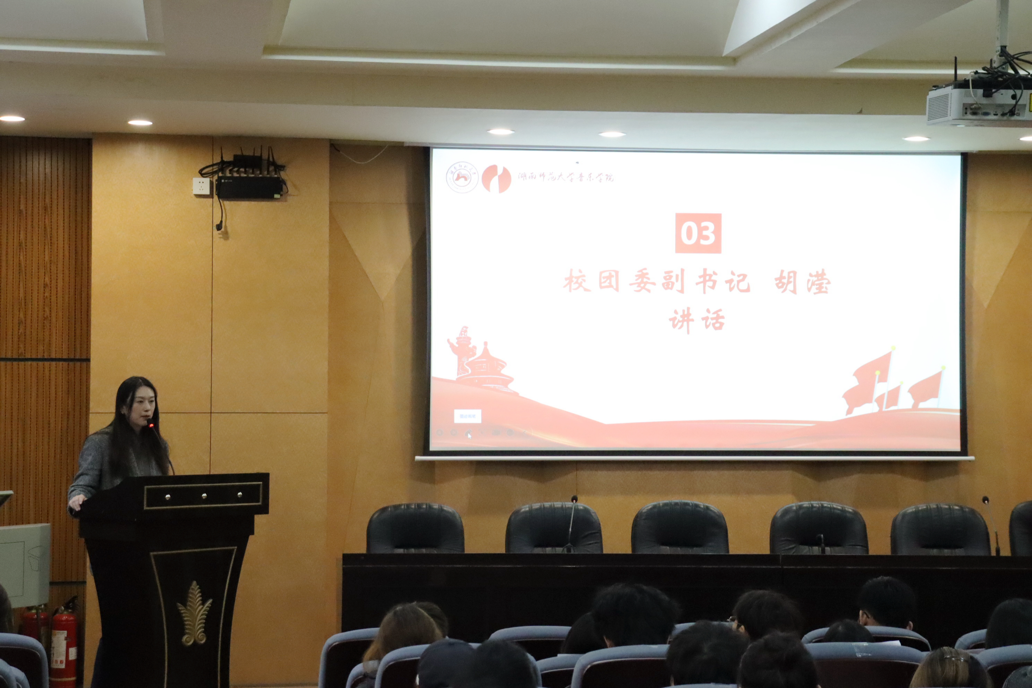 音乐学院学工办主任、2025级辅导员陈芳,2023级辅导员文佳豪,2024级辅导员刘冀及全体团员学生代表参加了大会。