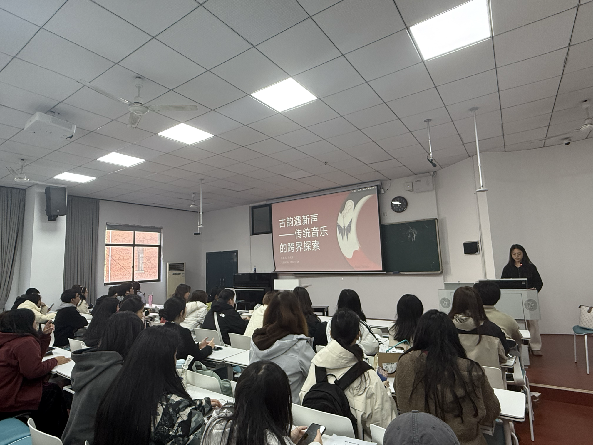 (唐安雅 粟菲儿 赵琪)2025年11月28日12:00,为了引导同学们对音乐跨界融合进行思考,湖南师范大学音乐学院在和乐楼308教室举办了“《古韵遇新声》——传统音乐的跨界探索”主题讲座。本次活动由2024级粟菲儿担任主持人,2024级许安珍担任主讲人。