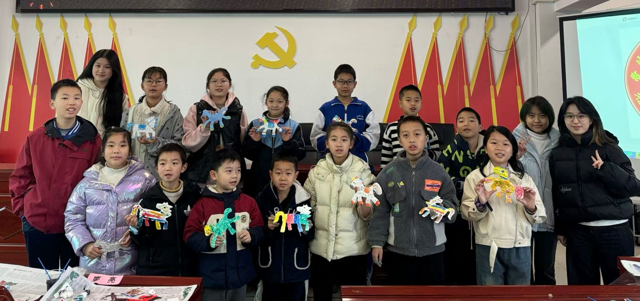 活动伊始,志愿者通过一段手势舞活跃了现场气氛。随后通过生动形象的讲解,向孩子们介绍了元旦的起源、历代习俗演变以及相关诗词典故,带领大家深入了解传统节日的文化内涵。知识竞答环节将气氛推向高潮,“元旦在古代被称为什么?”“‘元’与‘旦’分别代表什么?”等问题一问,孩子们便积极举手、踊跃抢答,他们在互动中巩固了所学知识。粘土作品制作环节,孩子们充满了期待,纷纷开始制作自己心中的小马形象,脸上洋溢着童真的笑容。