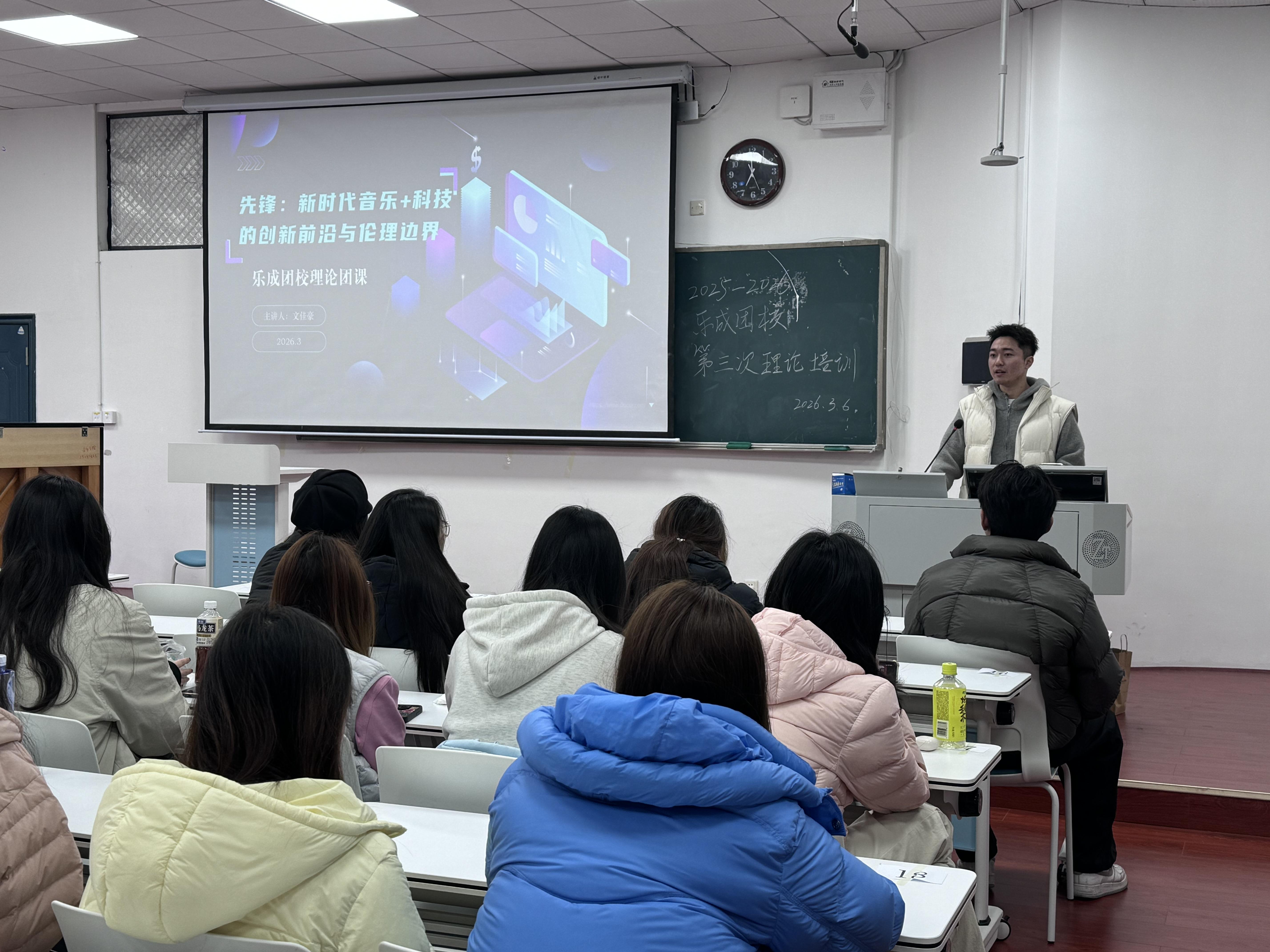 (通讯员 唐安雅 黄思涵 蔡雅丞)2026年3月6日中午,音乐学院“乐成团校”在和乐楼308教室举办第三次理论培训课。本次课程由2023级辅导员文佳豪老师担任主讲人,学院各团学组织成员共同参与学习。
