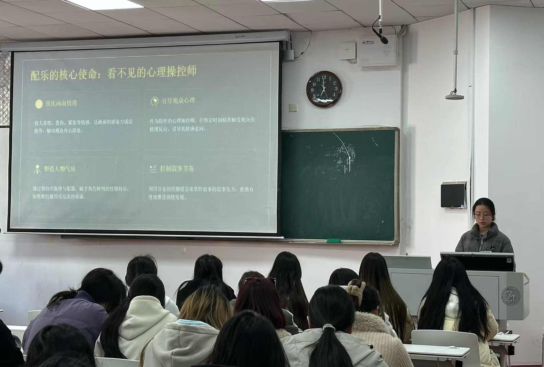 主讲人魏子瑄从调式、节奏、乐器、主题旋律四个维度逐层剖析。她指出,配乐作为电影的“第二语言”,承担着强化情绪、引导心理、塑造人物、控制节奏四大功能。调式上,大调让画面显得明亮温暖,小调则带出忧郁或神秘的感觉。节奏上,快节奏让人紧张,慢节奏让人舒缓,适当的停顿反而更有悬念。乐器上,钢琴适合表现细腻的情感,弦乐烘托动人时刻,铜管则展现气势和英雄气概。主题旋律上,一段好听的旋律反复出现,能让观众记住角色,也让故事更有代入感。她以《星球大战》“帝国进行曲”为例,阐释主题旋律如何成为角色的“声音名片”,并结合《闪灵》《泰坦尼克号》《复仇者联盟》《憨豆先生》等经典影片,逐一解读其配乐营造悬疑、浪漫、热血、诙谐等多元情绪氛围的艺术手法,带领同学们直观的感受了音乐对画面叙事的重要支撑。