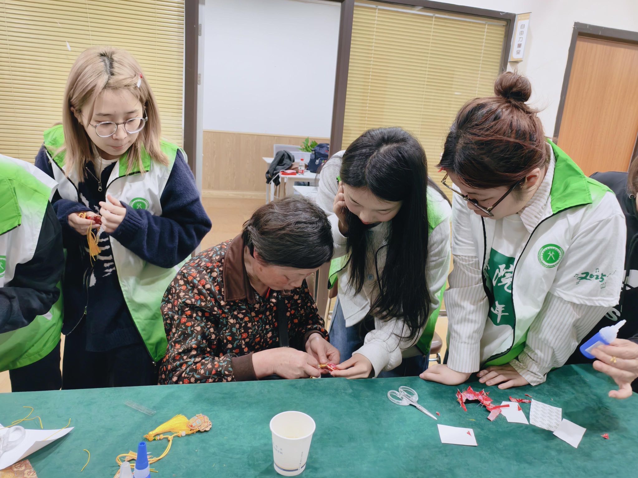 为了让老人们在此次活动中获得更好的体验,志愿者们提前准备好宋锦布料、挂绳、流苏、针线等全套材料,并耐心地为老人们讲解制作步骤,示范裁剪、拼接、穿绳、固定流苏等操作细节。活动中,志愿者全程在旁协助老人,细心调整细节、帮忙处理针线难题。现场氛围轻松和睦,老人们认真构思、细心缝制,专注投入手作过程,大家互相探讨做法、分享心得。活动尾声,志愿者们与老人们一同展示成品,留下合影,定格美好回忆。